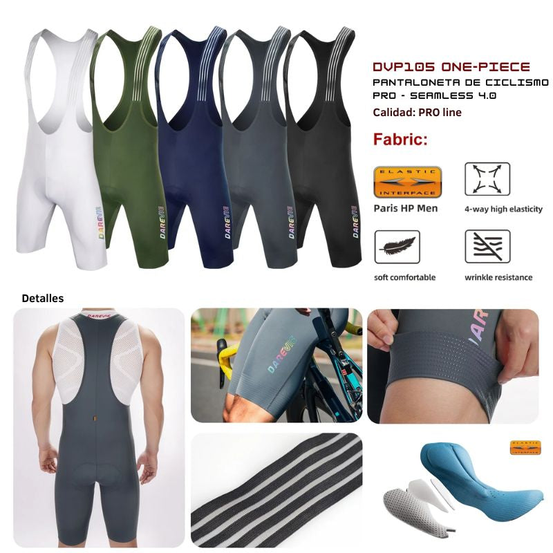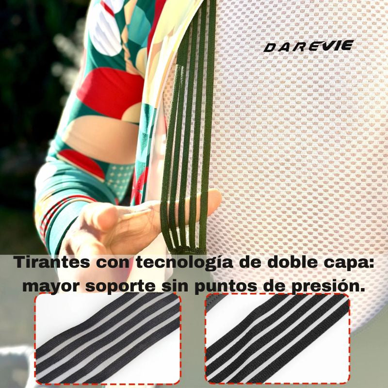 - Cargaderas de Doble Capa: Tirantes elásticos diseñados para distribuir la presión uniformemente sobre los hombros, manteniendo la pantaloneta en su sitio sin importar la intensidad del pedaleo.